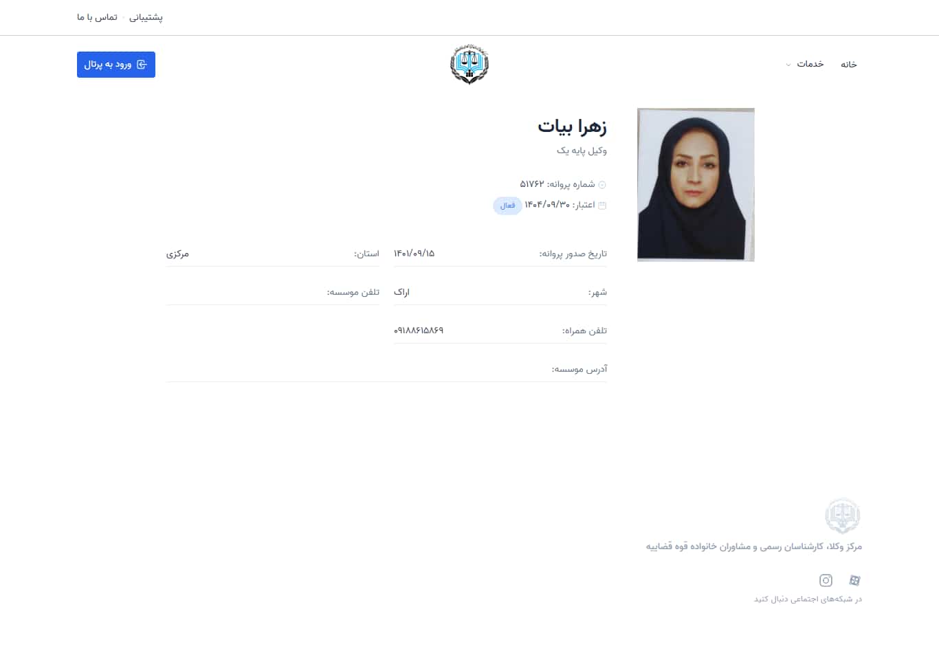 خانم زهرا بیات، وکیل پایه یک دادگستری، عضو کانون وکلای دادگستری مرکز با شماره پروانه ۵۱۷۶۲ میباشند. ایشان در شهر اراک فعالیت میکنند و در زمینههای مختلف حقوقی از جمله دعاوی حقوقی، کیفری، خانواده، ملکی و انحصار وراثت تخصص دارند. برای دریافت مشاوره حقوقی یا تنظیم وقت ملاقات، میتوانید از طریق شماره تماس ۰۹۱۸۳۶۷۰۴۹۷ با ایشان در ارتباط باشید.