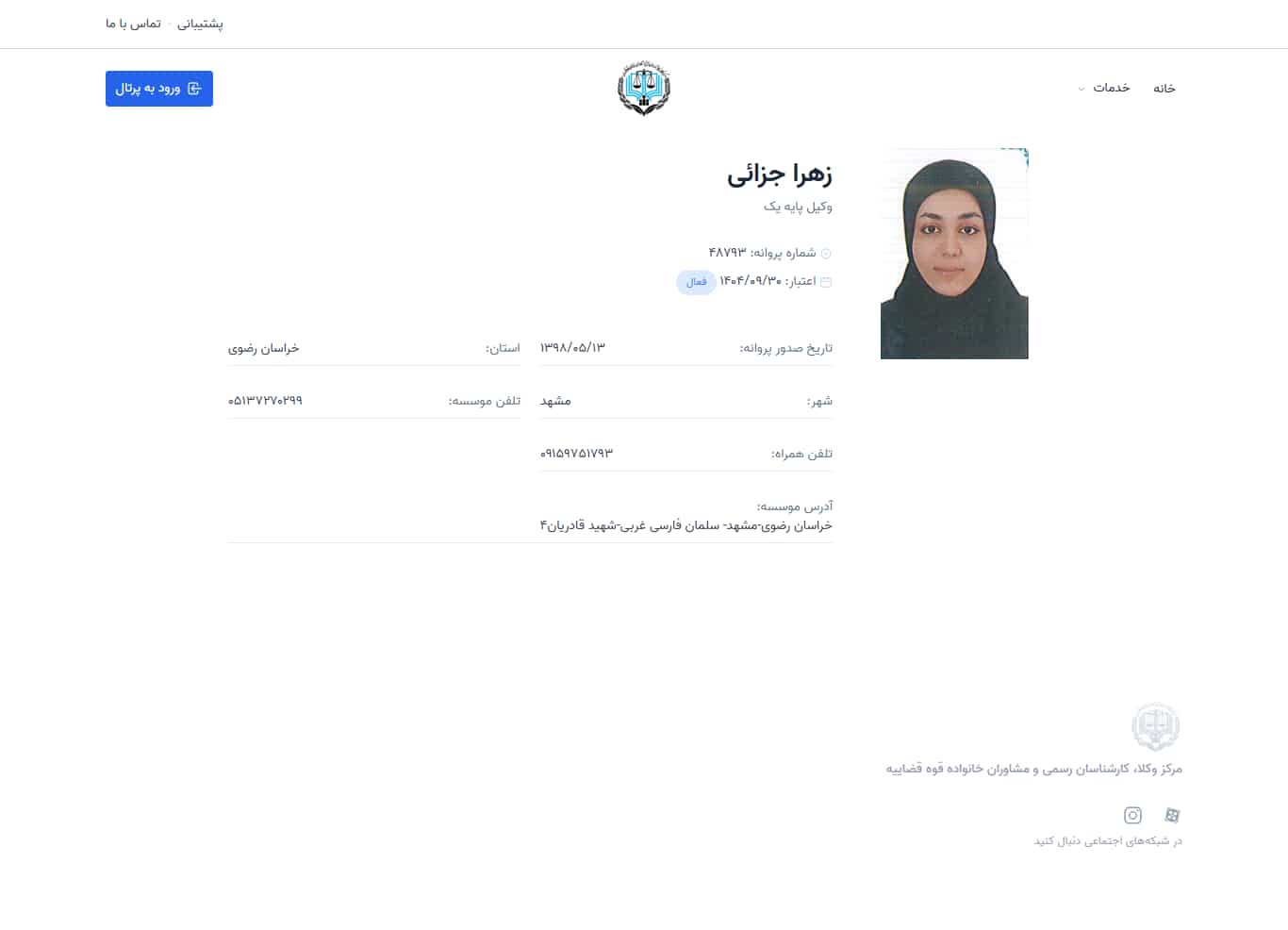 خانم زهرا جزائی، وکیل پایه یک دادگستری و عضو مرکز وکلای قوه قضاییه، با شماره پروانه ۴۸۷۹۳، از وکلای توانمند و خوشنام در شهر مشهد است. دفتر ایشان در منطقه سلمان فارسی غربی واقع شده و خدمات حقوقی متنوعی در حوزههای مختلف به موکلان ارائه میدهد.