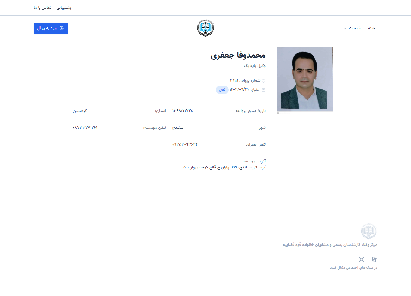 آقای محمدوفا جعفری، وکیل پایه یک دادگستری و عضو مرکز وکلای قوه قضاییه با شماره پروانه 49111، از وکلای با تجربه و معتبر در سنندج است. ایشان با سابقه فعالیت گسترده در زمینه وکالت، پرونده های حقوقی و کیفری را با دقت و تعهد پیگیری می کند و همواره در تلاش است تا بهترین نتایج قانونی برای موکلان خود حاصل شود.